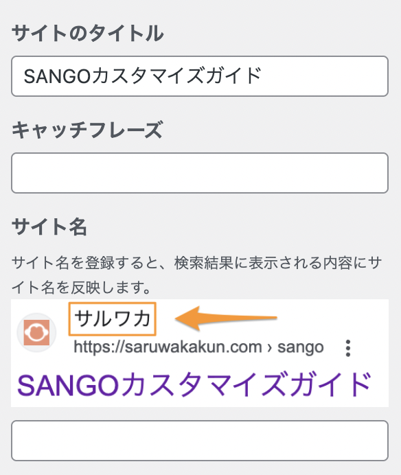 サイトを表すキャッチフレーズを一言でつけます。と言ってもこのフレーズはサイト内で目に見える形では表示されません。どこに使われるかというと、Google等に認識してもらうトップページのタイトル(titleタグ)に使われます。例えばサイトのタイトルを「SANGO」、キャッチフレーズを「分かりやすさを追求したWordPressテーマ」とした場合、Googleには以下のようにインデックスされます。